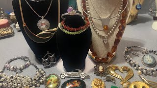 08. i am showing jewelry i thrifted yesterday. kunio matsumoto trifari, amber, sterling, labradorite, amethyst, napier, russian pin,